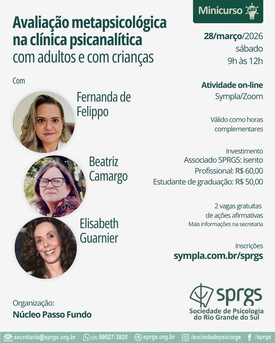 - Fernanda de Felippo: psicóloga, psicanalista em formação pela Constructo Instituição Psicanalítica. Membro da SPRGS e do Núcleo Passo Fundo da SPRGS.