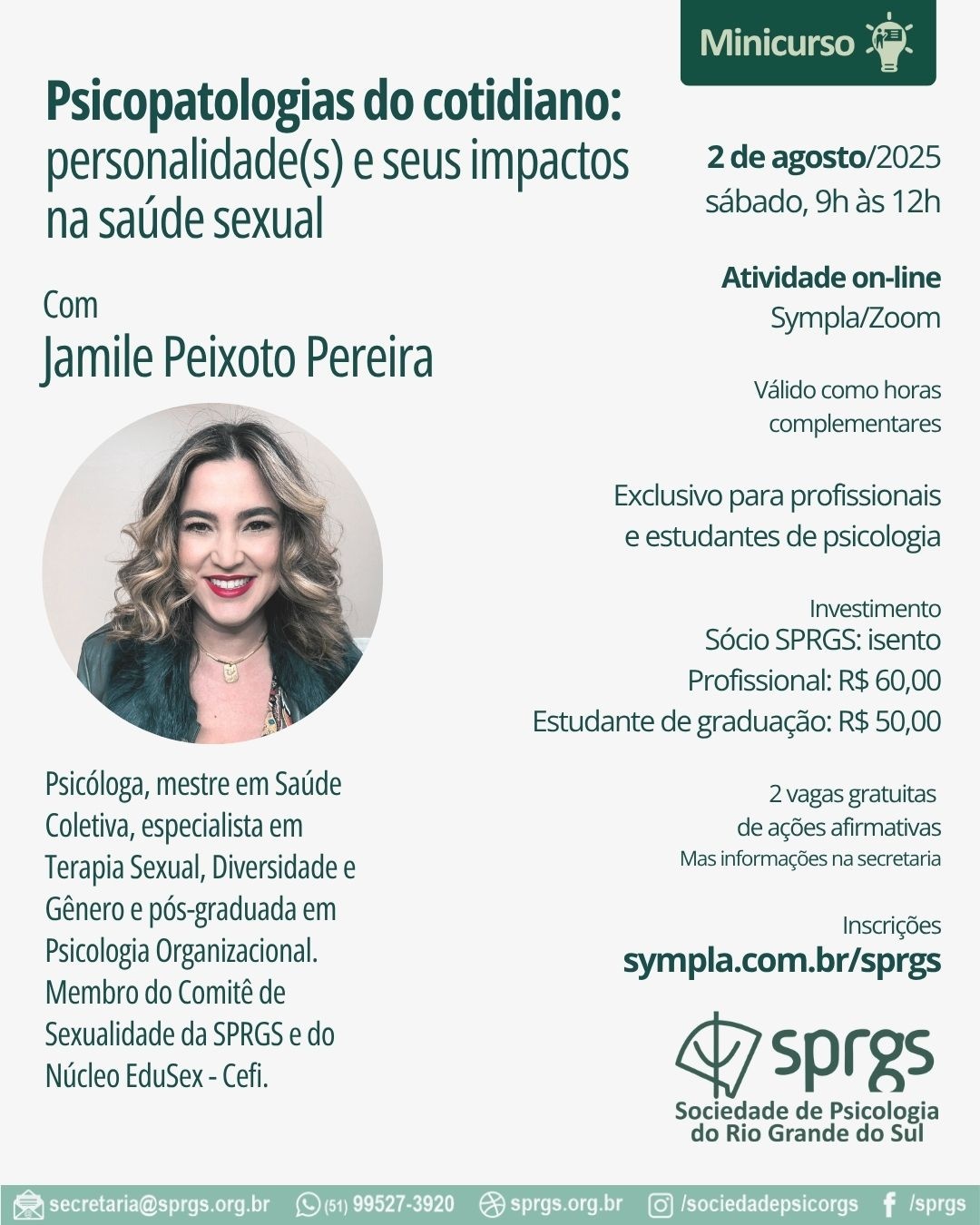 - Jamile Peixoto Pereira: psicóloga, mestre em Saúde Coletiva, especialista em Terapia Sexual, Diversidade e Gênero e pós-graduada em Psicologia Organizacional. Docente em cursos de pós-graduação - Cefi (Centro de Estudos da Família e do Indivíduo) e InTcc (Instituto de Terapias Cognitivo-Comportamentais) e convidada no IPTC (Instituto Paranaense de Terapias Cognitivas). Supervisora e orientadora de TCCs na Especialização em Sexologia Clínica. Membro do Comitê de Sexualidade da SPRGS e do Núcleo EduSex - Cefi. Subdelegada da Região Sul na SBRASH - Sociedade Brasileira de Sexualidade Humana.
