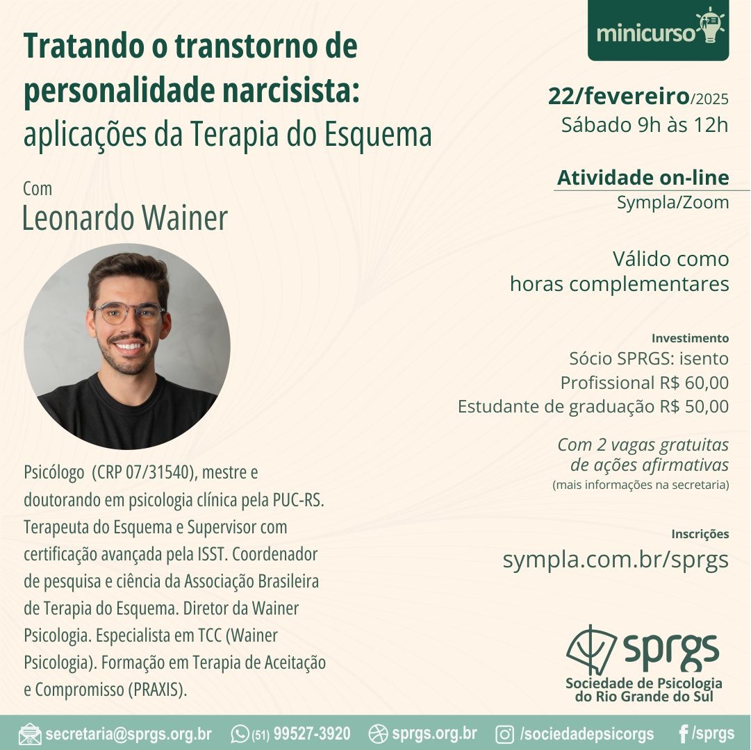- Leonardo Wainer (CRP 07/31540): psicólogo, mestre e doutorando em psicologia clínica pela PUC-RS. 1º Diretor Executivo Latino-Americano da ISST - Sociedade Internacional de Terapia do Esquema (2020-2024). Terapeuta do Esquema e Supervisor com certificação avançada pela ISST. Coordenador de pesquisa e ciência da Associação Brasileira de Terapia do Esquema. Diretor da Wainer Psicologia. Especialista em TCC (Wainer Psicologia). Formação em Terapia de Aceitação e Compromisso (PRAXIS).