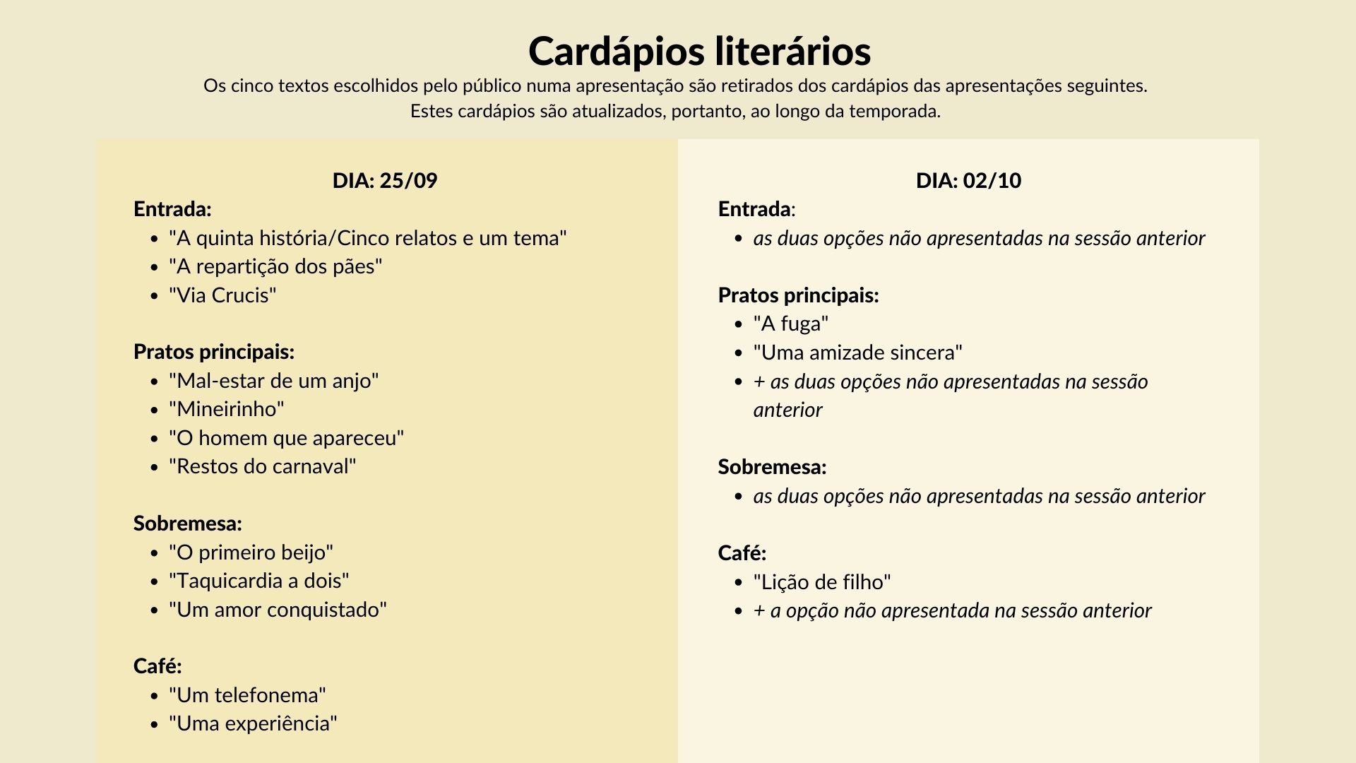 Reunindo obras que traçam um breve panorama das múltiplas facetas da autora, o "cardápio literário" oferece narrativas de onde eclodem personagens diversos, como um poeta frustrado, uma senhora idosa sozinha no mundo, uma mulher virgem que está grávida, uma esposa em fuga, além da própria Clarice em diferentes fases da vida: a infância em Recife, a vida de casada na Europa, a idade adulta no Rio de Janeiro.