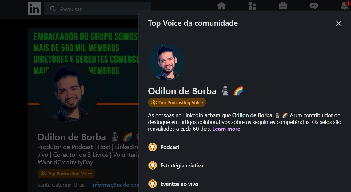 Top Voice LinkedIn Podcast, Estratégia Criativa e Eventos ao vivo.