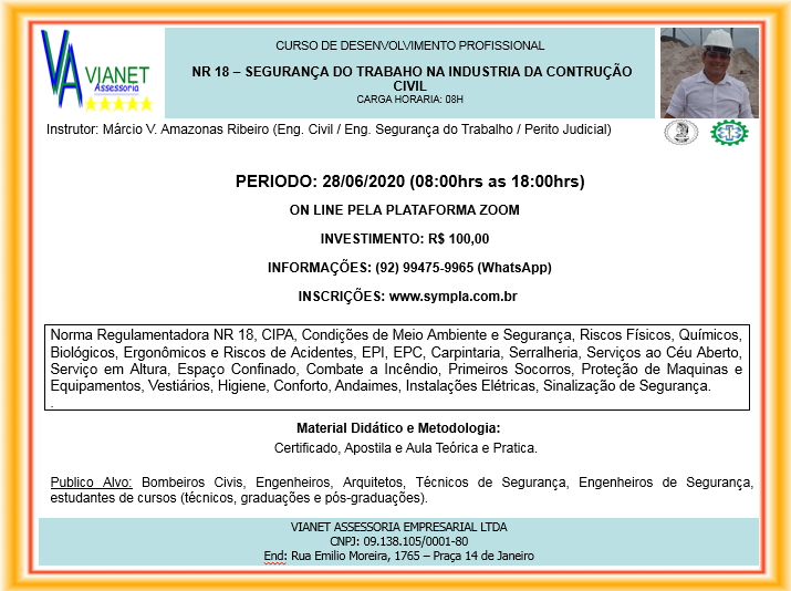 Engenheiro Civil com Espacialização em Engenharia de Segurança do Trabalho, Perito Judicial, Bombeiro Civil Mestre, cadastrado no Corpo de Bombeiros é autor de inúmeros projetos de Prevenção e Combate a Incêndio (comerciais, serviços, industriais e residenciais) aprovados pelo CBM, possui grande acervo técnico em Projetos e Laudos Ergonômicos para fins de processos judiciais, foi engenheiro voluntário convidado pela DAT – Diretoria de Atividades Técnicas, setor de analise de projetos do Corpo de Bombeiros Militar do Amazonas em 2018, atua no setor de incorporação em uma construtora nacional é diretor e responsável técnico da empresa Vianet Assessoria Empresarial Ltda.