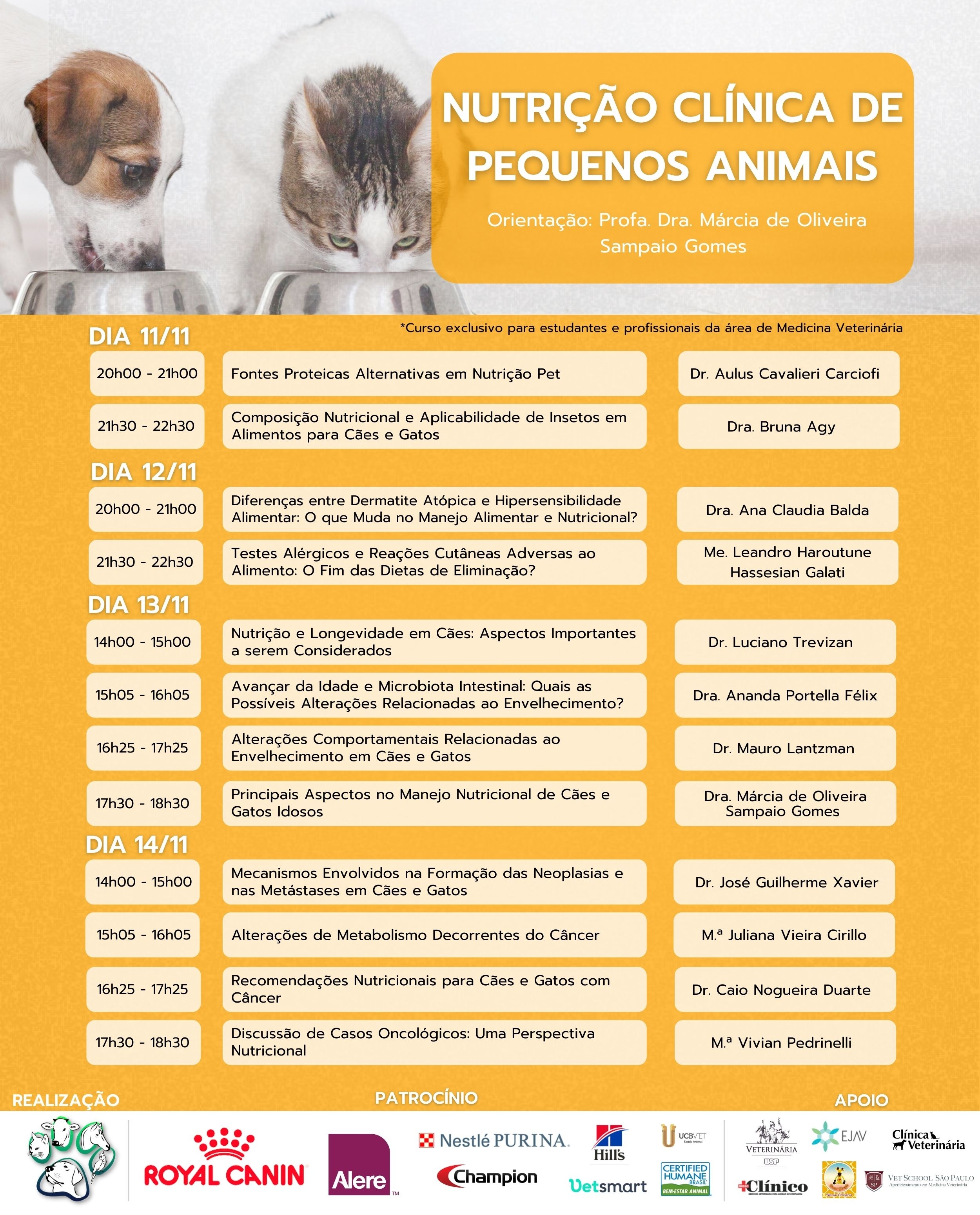 Como o curso irá agregar a sua trajetória profissional: o curso busca abordar novas tendências do mercado de forma a manter o estudante/profissional sempre atualizado quanto aos estudos que vêm sendo realizados no setor, como por exemplo, a aplicabilidade de insetos em formulações de alimentos para cães e gatos e fontes proteicas alternativas em nutrição pet. Além disso, o curso contará com 2 blocos de 4 palestras cada, focados em geriatria e oncologia, dois perfis de pacientes que vêm sendo mais frequentes na rotina de atendimento clínico e que, portanto, são conhecimentos essenciais para quem busca se tornar referência na área de Clínica Médica de Pequenos Animais