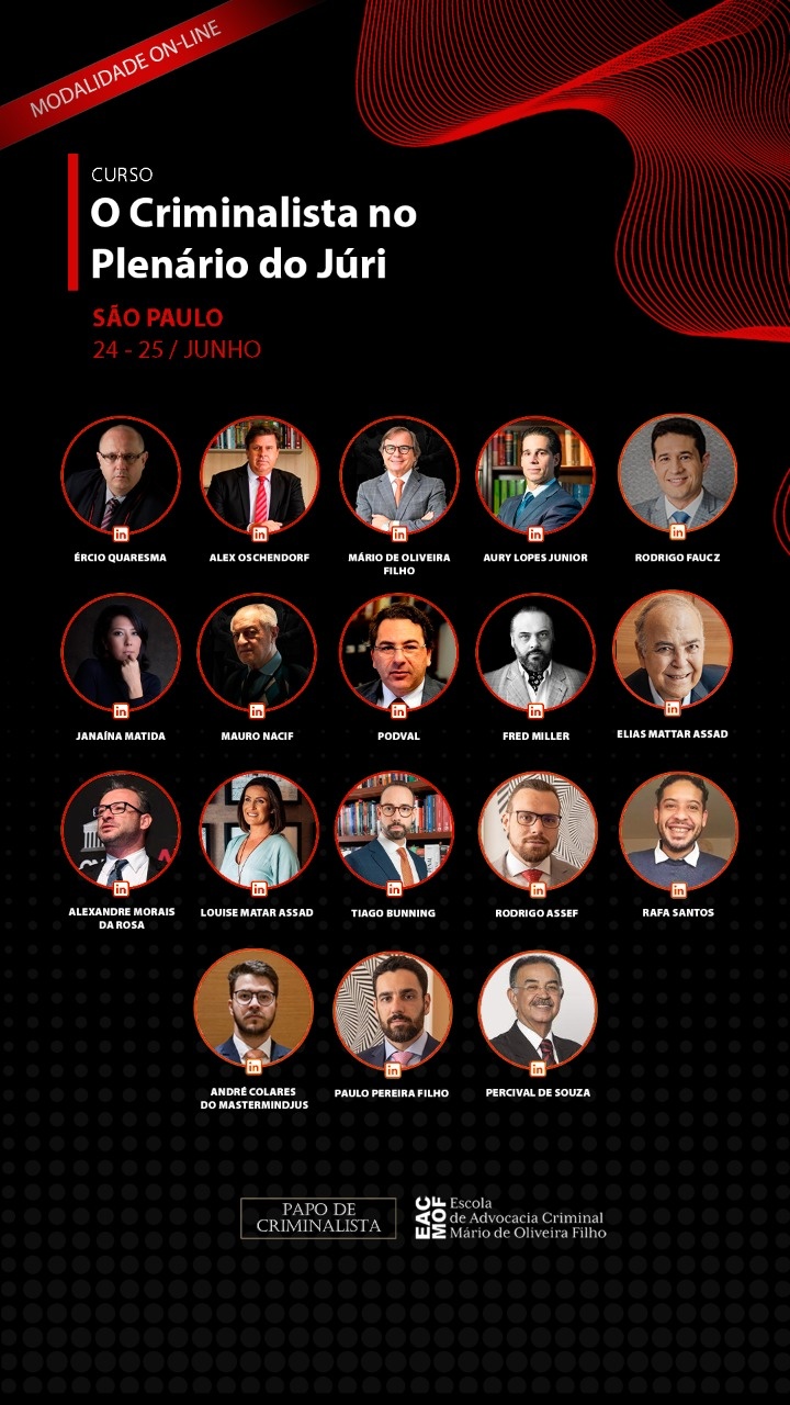 No curso, você fará uma imersão de dois dias com os mais experientes tribunos do Júri como Ércio Quaresma, Aury Lopes Jr, Mauro Nacif, Mário de Oliveira Filho, Alex Oschendorf, com o juiz e doutrinador Alexandre Morais da Rosa e outros nomes renomados.