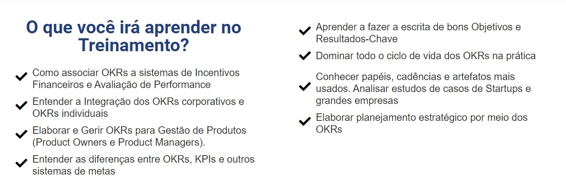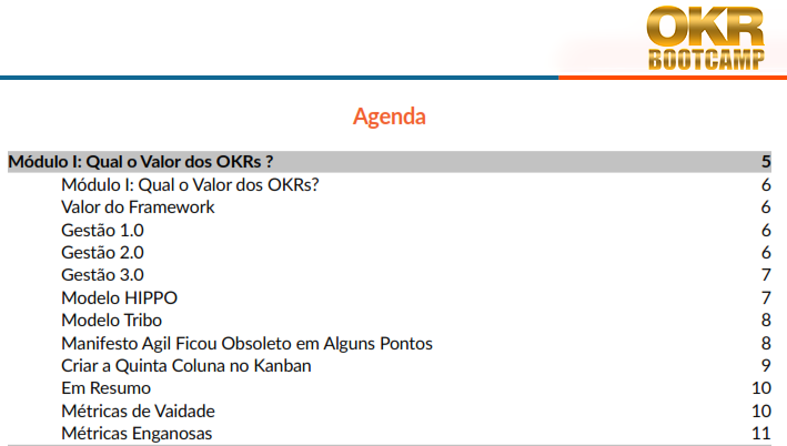 O Treinamento de OKRs Pioneiro do mercado. O Unico com Jogos de imersão exclusivos: (1) Julgamento dos OKRs (2) OKR Challenge Game, (3) My Top Product HOSKR, (4) Check-in Game (Hacks de monitoramento), QUATRO DIAS DE ATIVIDADES COM OKRS.