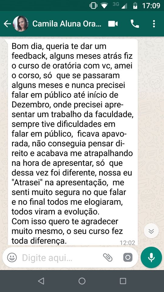 Mensagem da Camila pelo WhatsApp - já deixando claro que ela NÃO "Atrasou" na apresentação. Ela ARRASOU!