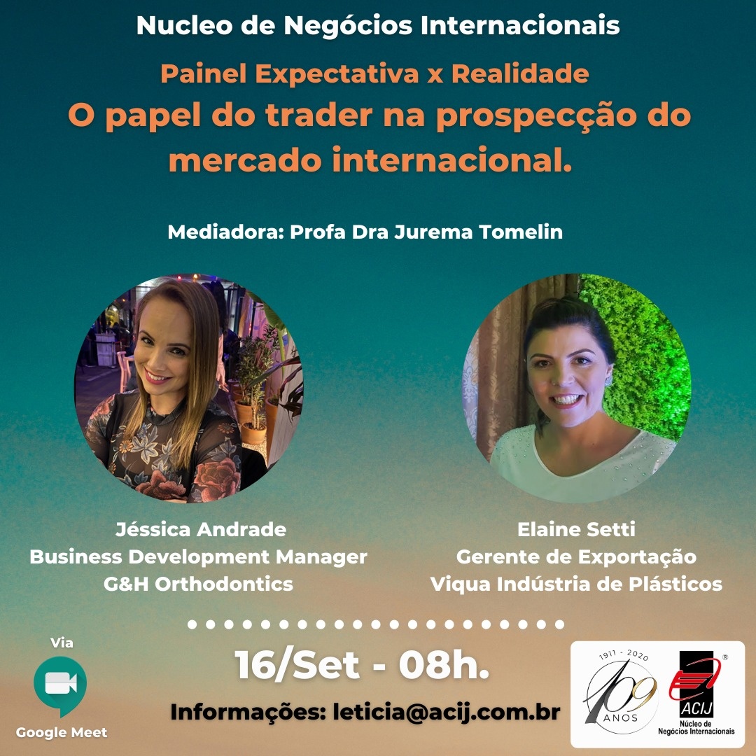 • 08:10:00 às 09:15 - Painel Expectativa x Realidade: O papel do trader na prospecção do mercado internacional, com Jéssica Andrade, Business Development Manager, G & H Orthodontics e Elaine Setti, Gerente de Exportação Víqua Indústria de Plásticos.