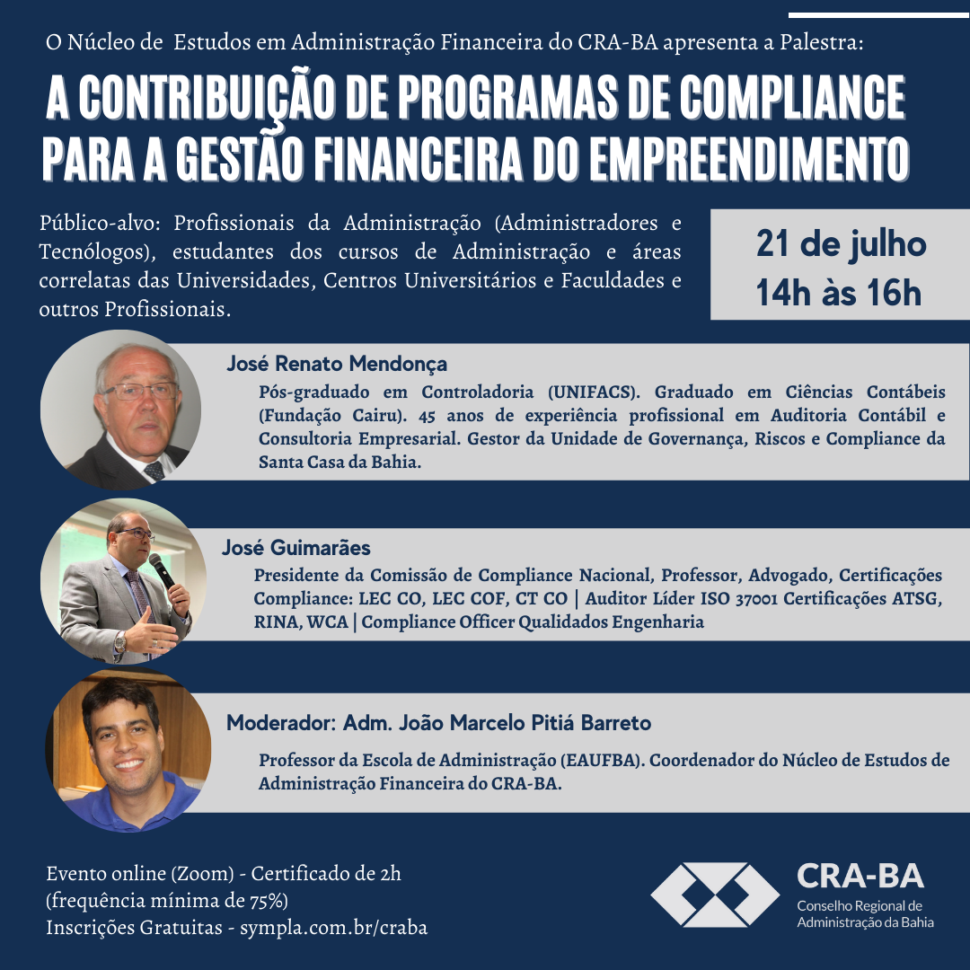 DADOS PESSOAIS: Ao realizar a inscrição no presente evento, curso ou palestra, a(o) Participante consente e concorda que o Conselho Regional de Administração da Bahia (CRA-BA) colete os seguintes dados pessoais: nome e sobrenome, RG, CPF, endereço de e-mail, endereço completo, número de telefone, profissão, área de atuação, nível de instrução ou escolaridade, e que utilizará os dados pessoais do Participante para possibilitar que o CRA-BA envie ou forneça à(ao) Participante informações sobre cursos, palestras e suas atividades em geral.