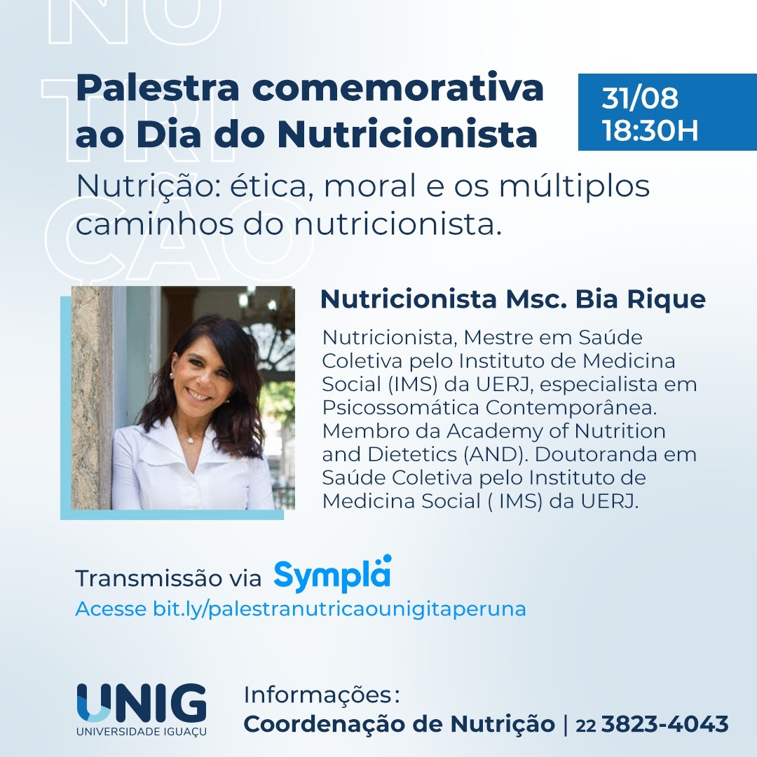 Palestra em comemoração ao DIA DO NUTRICIONISTA, organizada pela Coordenação de Nutrição da UNIG - Campus V -, e ministrada pela nutricionista convidada Bia Rique.