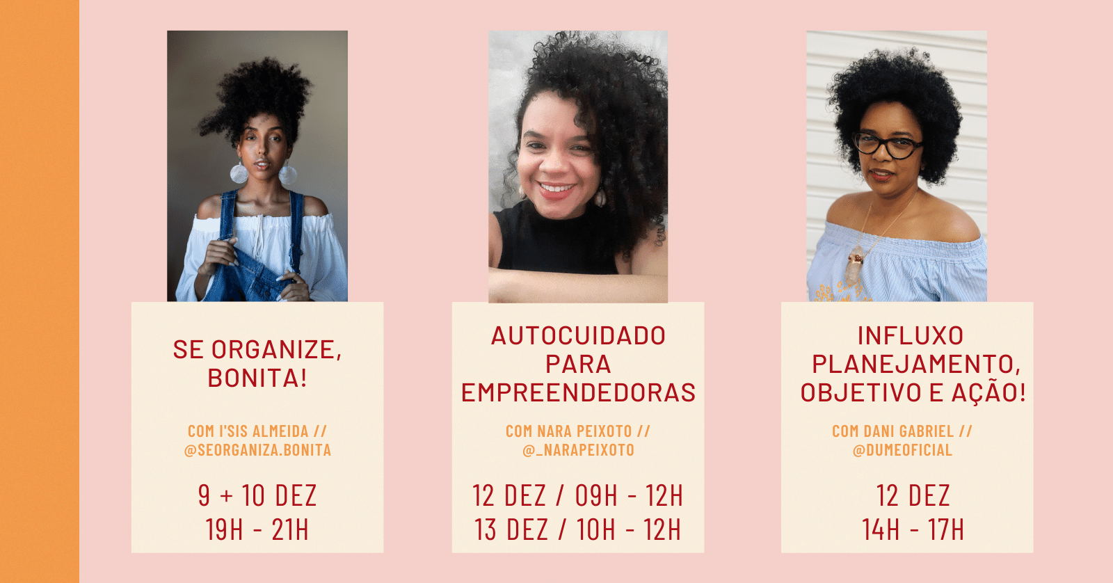 A gente começa organizando, com a I'sis Almeida no curso SE ORGANIZE, BONITA - organização pessoal para mulheres bravas. Seguimos trabalhando o interno, com a Nara Peixoto no curso AUTOCUIDADO PARA EMPREENDEDORAS e, por fim, vamos de planejamento para ações potentes com INFLUXO - planejamento, objetivo, ação!, junto com a Dani Gábriél.