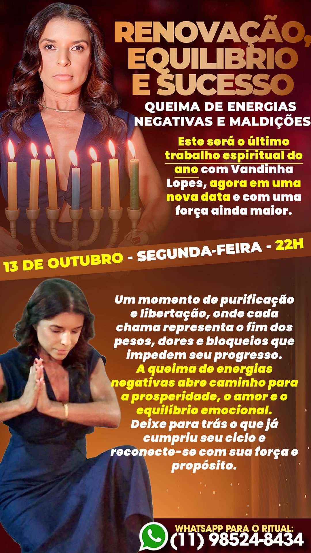 Por orientação espiritual, o trabalho com Vandinha Lopes foi transferido para o dia 13 de outubro, início da Lua Minguante, fase que marca o momento ideal para libertar o corpo e a mente de energias negativas, carmas e padrões que impedem o progresso. Essa mudança vem ao encontro da necessidade coletiva de purificação, equilíbrio e renovação interior, diante de um ano em que muitos sentiram o peso emocional, mental e espiritual das dificuldades.