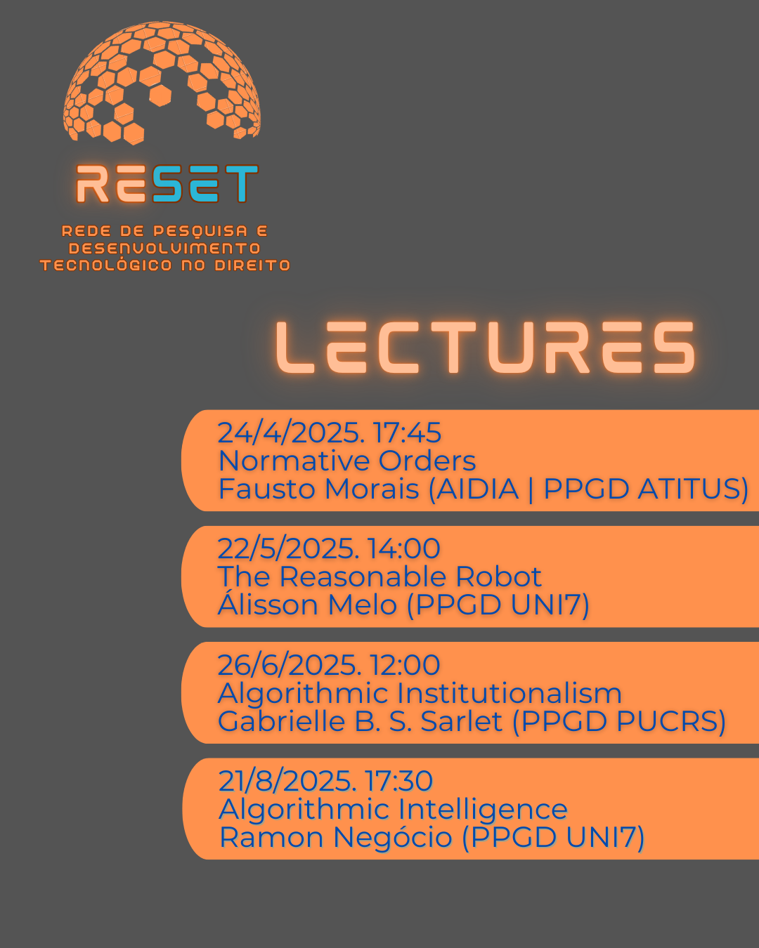 A RESET LECTURES é uma iniciativa da Rede de Pesquisa e Desenvolvimento Tecnológico no Direito - RESET, visando estabelecer um diálogo sobre as principais temáticas que envolvem a Tecnologia, Inteligência Artificial e Direito. O grupo de professores integrantes da rede assumiram a tarefa de eleger uma temática e um respectivo texto relacioando para expôr aos seus pares da rede e demais pesquisadores interessados.
