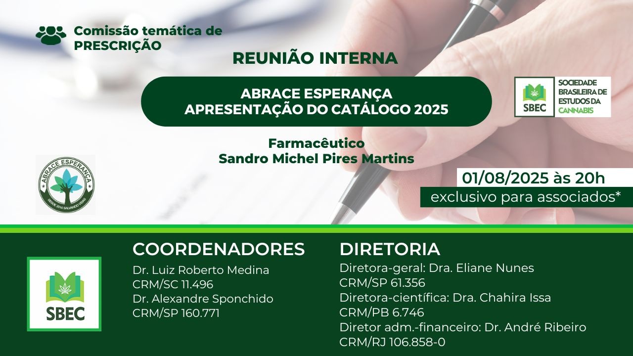 Estaremos recebendo o farmacêutico da Associação Abrace Esperança de Paraíba Sandro Michel Pires Martins, primeira associação brasileira a conseguir judicialmente a autorição de cultivo, extração, dispensação e fornecimento de produtos à base de Cannabis, que virá apresentar tanto a Abrace, como também, o catálogo de produtos 2025 da associação, além de tirar dúvidas dos nossos associados.