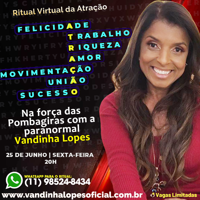 Com o objetivo de atrair Felicidade, Trabalho, Riqueza, Amor, Movimentação, União familiar e sucesso, a vidente Vandinha Lopes realiza o Ritual da Atração, trabalhando na força das Pombagiras, entidades espirituais que desperta em nosso intimo o desejo de realizar. Sem elas, desistiríamos facilmente daquilo que buscamos , assim que surgir as dificuldades em nosso caminhos.