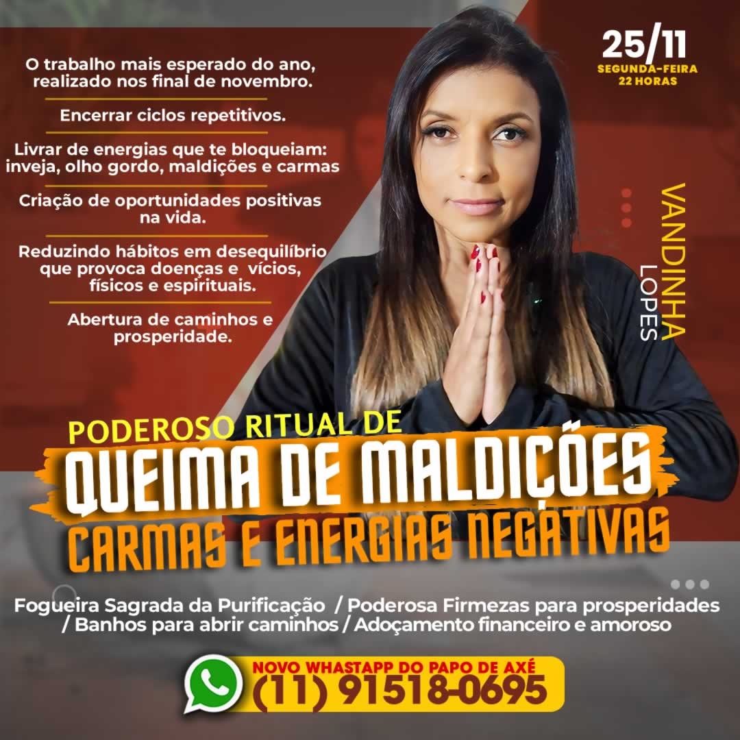 A vidente e terapeuta holística Vandinha Lopes, seguindo orientações de seus guias, realiza o Ritual de Queimas de Maldições, Karmas e Energias Negativas, um trabalho poderoso que acontece junto aos seus filhos de fé e que agora realiza de forma online, aberto a todo público, como forma de ajudar e orientar as pessoas que estão passando por dificuldades na vida.