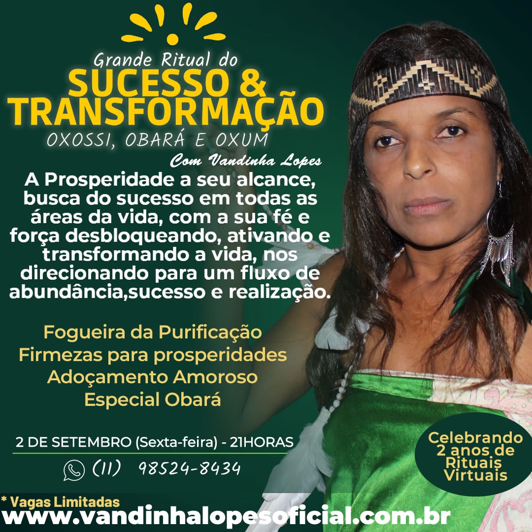 Nesse Ritualdo Sucesso e Transformação, Vandinha Lopes trabalhará na energia do orixá Oxossi, ele que traz a fartura e a abundância para todos os seus filhos e devotos. Suas principais características são a ligeireza, a astúcia, a sabedoria e o jeito ardiloso para capturar a caça. Sua arma é o arco e a flecha, que mostra sua precisão de acertar o alvo. As “flechadas certeiras” mostram sua determinação e objetividade firmes.