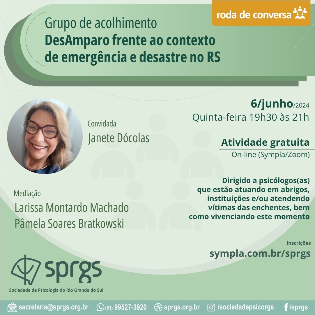 Convidamos os(as) psicólogos(as) que estão atuando em abrigos e/ou instituições, acolhendo de forma remota às vítimas das enchentes ou profissionais que estão trabalhando nestes contextos, bem como estão escutando a seus pacientes que foram direta ou indiretamente afetados a participarem do nosso Grupo de acolhimento.