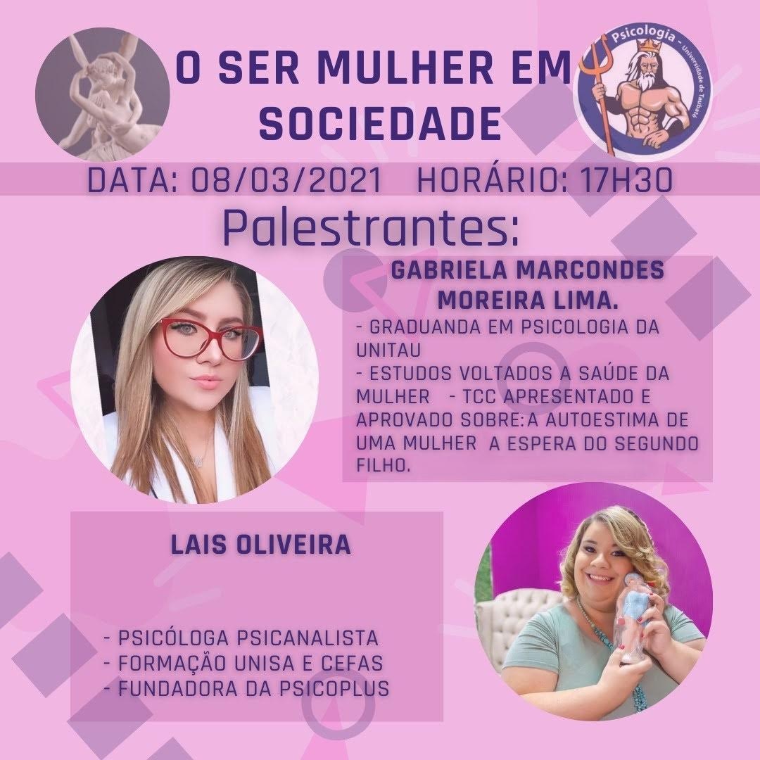 Convidadas: Laís Oliveira - psicóloga e psicanalista. Com formação UNISA e CEFAS, fundadora da Psicoplus. Gabriela Marcondes Moreira Lima - estudante do último ano de psicologia da UNITAU, com TCC apresentado e aprovado sobre a Autoestima de uma mulher à espera do segundo filho. Organizado e mediado por: D.A. de psicologia da Unitau, representado por Rebeca Poliane de Oliveira e Evelyn de Oliveira Leite nesse evento.