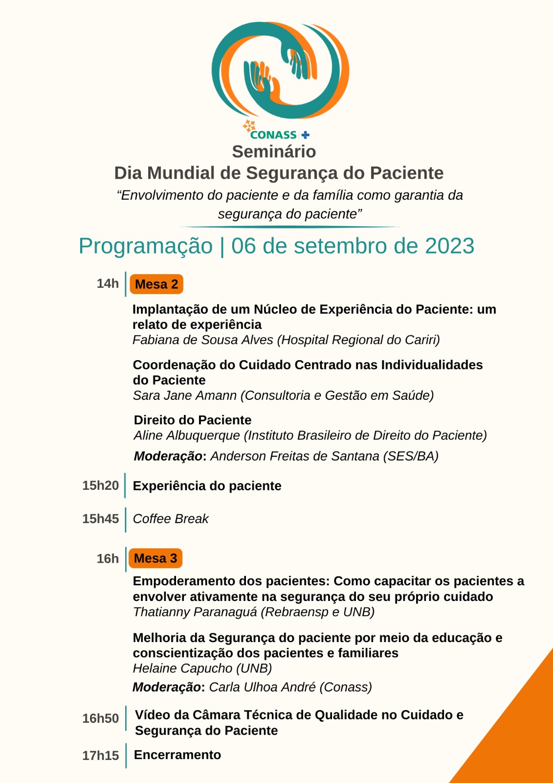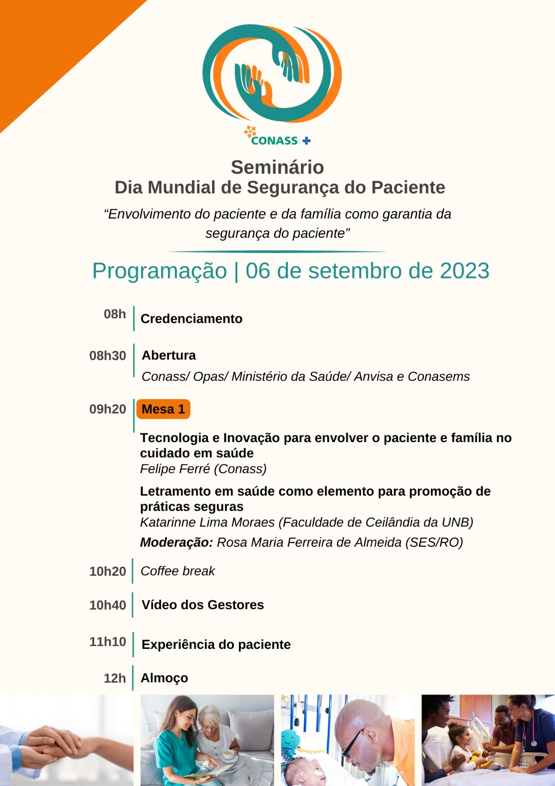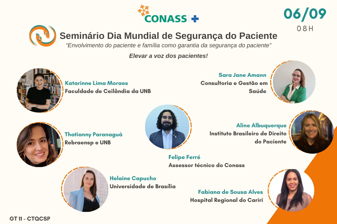 O seminário em alusão ao Dia Mundial de Segurança do Paciente "Envolvimento do Paciente e da Família como garantia da Segurança do Paciente" é uma realização do Conselho Nacional dos Secretários de Saúde (CONASS), por meio da Câmara Técnica de Qualidade no Cuidado e Segurança do Paciente (CTQCSP), representada por todos os estados da federação.