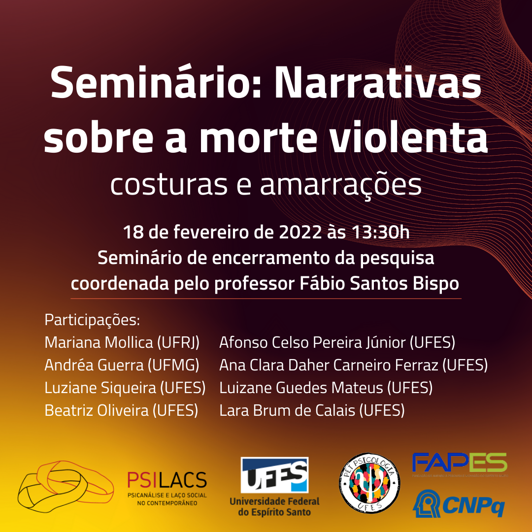 A pesquisa “Narrativas sobre a morte violenta: análises teóricas e clínicas de abordagem psicanalítica”, financiada por meio do Edital CNPq/FAPES Nº 22/2018 - PROGRAMA PRIMEIROS PROJETOS – PPP, teve início em abril de 2019 e finalizou em janeiro de 2022. O objetivo foi elucidar os modos pelos quais a morte violenta se inscreve na relação do sujeito com o laço social, a partir de leituras clínicas que contemplaram as dimensões Real, Simbólica e Imaginária (RSI) explicitadas em diferentes tipos de narrativa. É urgente a intensificação do debate acerca da morte violenta, na medida em que novos cenários escancaram antigas políticas deliberadas de extermínio nas periferias. Por meio desta pesquisa, construímos uma interlocução com a rede pública de atenção à violência na Grande Vitória e fortalecemos nossas interlocuções com outros coletivos, como o Núcleo de Psicanálise e Laço Social no contemporâneo (PSILACS-UFMG), a Rede Internacional de Pesquisa em Criminologia e Psicanálise (RICA) e a Articulação Nacional de Psicólogas negras e pesquisadores (ANPSINEP). Propusemos sete subprojetos de iniciação científica e realizamos vários eventos acadêmicos, nos quais estudamos a metodologia de análise psicanalítica de narrativas, em diálogo com as escrevivências de Conceição Evaristo. Realizamos análises críticas e clínicas de narrativas literárias e cinematográficas, com destaque para as narrativas de pessoas atingidas pela morte violenta, como mães de jovens assassinados, pessoas transsexuais e mães encarceradas. Destacamos o racismo e o sexismo como determinantes na produção de mortes violentas no Brasil. Daí a importância de noções como necropolítica, genocídio da população negra e violência masculina serem articuladas com as cicatrizes da escravização. As narrativas e escrevivências podem ser pensadas como formas de amplificar vozes sistematicamente silenciadas, permitindo uma reescrita que subverta as condições sociais de dominação e de morte. Será um prazer compartilhar com vocês um pouco dos resultados deste trabalho!