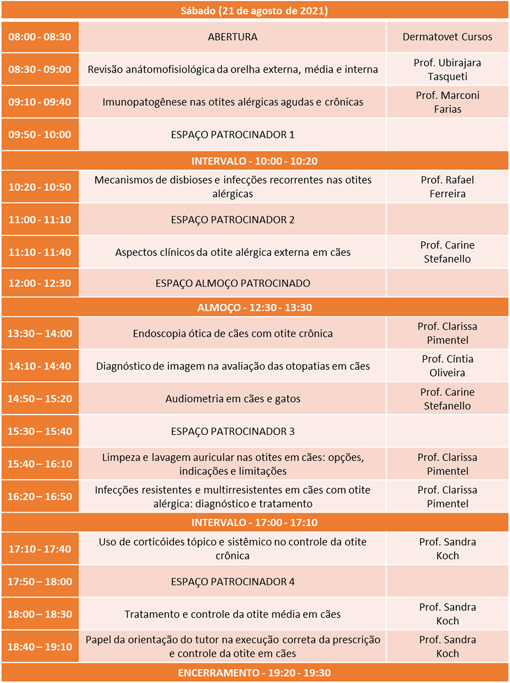 O Simpósio ocorrerá de forma integralmente online, em formato remoto interativo, no sábado, dia 21/08/2021 e contará com 12 palestras de professores renomados em dermatologia, alergia e otopatia veterinária.
