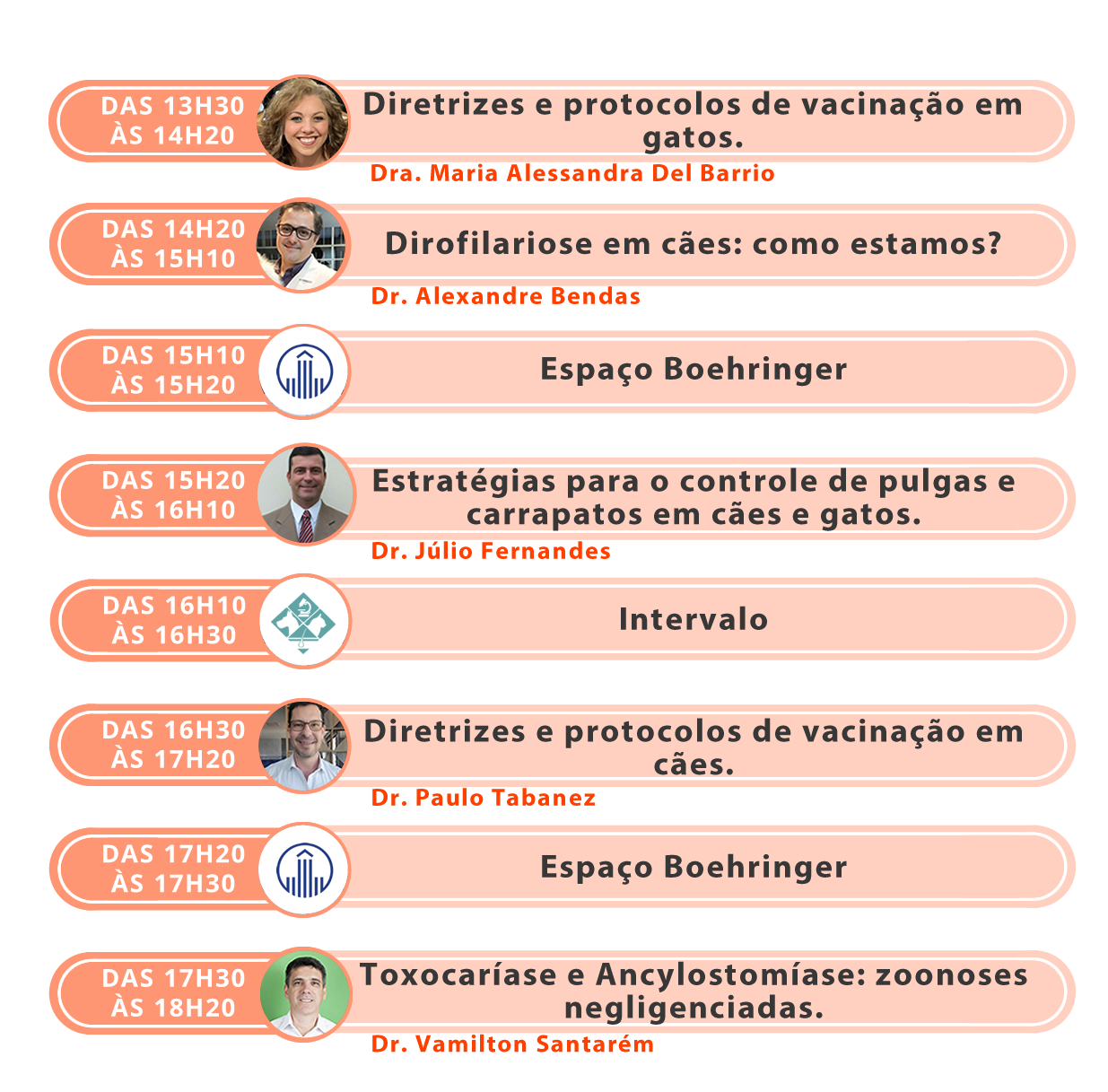 O “Simpósio de Medicina Preventiva Veterinária” promovido pela Dermatovet Cursos Cursos com patrocínio exclusivo da Boehringer visa abordar temas específicos relativos à prevenção das principais doenças transmitidas por vetores na clínica de pequenos animais, além de debater os principais protocolos de vacinação em cães e gatos. O encontro ocorrerá dia 19/11/2022 em formato online e ao vivo, permitindo interação entre professores e alunos. O tempo de duração de cada palestra será de 40 minutos com breve espaço para perguntas e respostas.