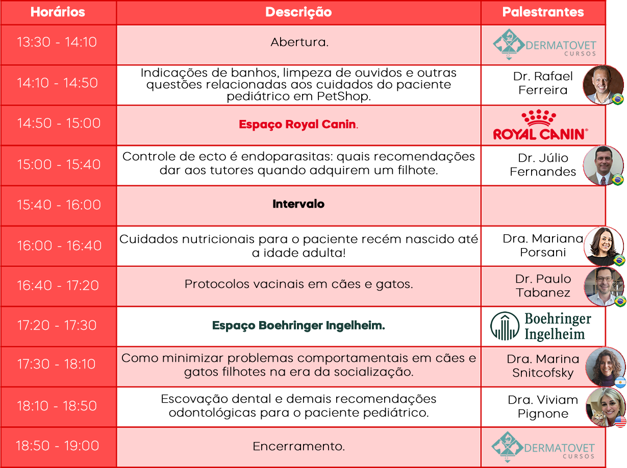 O Simpósio sobre Orientações Pediátricas em cães e gatos visa promover a explanação e o debate frente as principais indicações do Médico Veterinário junto aos tutores e seus pacientes recém nascidos. Na era da socialização dos pets sabemos o quanto é importante o Médico Veterinário estar bem embasado cientificamente para repassar orientações pediátricas corretas aos seus clientes. Atualmente ainda é muito comum os donos de animais procurarem o Médico Veterinário somente entre 45 a 60 dias de vidas do seu pet para a primeira dose vacinal.