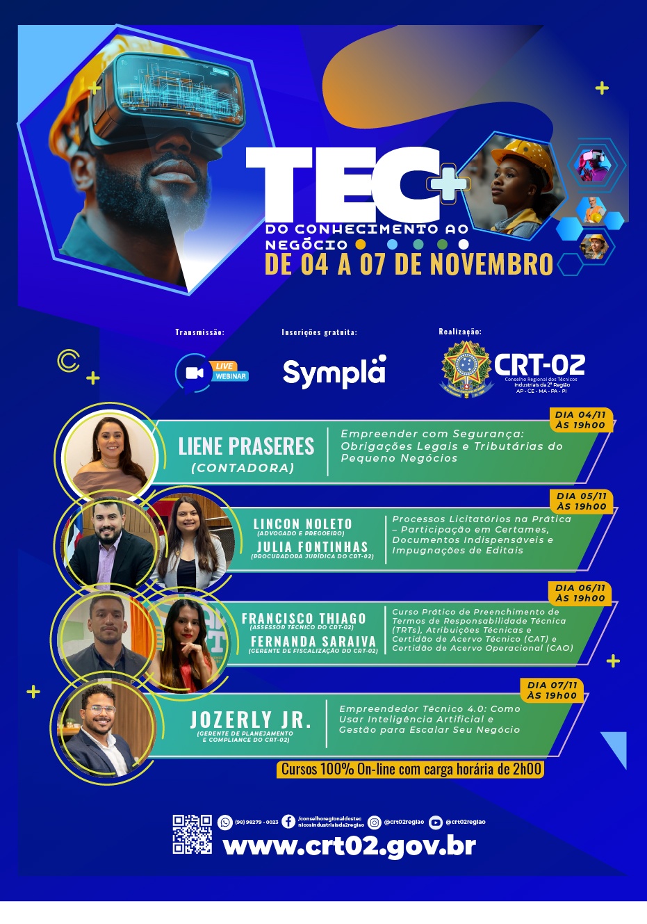 O Conselho Regional dos Técnicos Industriais da 2ª Região (CRT-02) promoverá, entre os dias 4 a 7 de novembro de 2025, evento online “TEC+ | Do Conhecimento ao Negócio” aos técnicos registrados no CRT-02. O TEC+ é um projeto de qualificação e aperfeiçoamento profissional voltado aos Técnicos Industriais, com o objetivo de fortalecer o conhecimento técnico, estimular o empreendedorismo e promover a valorização da categoria por meio da qualificação contínua.