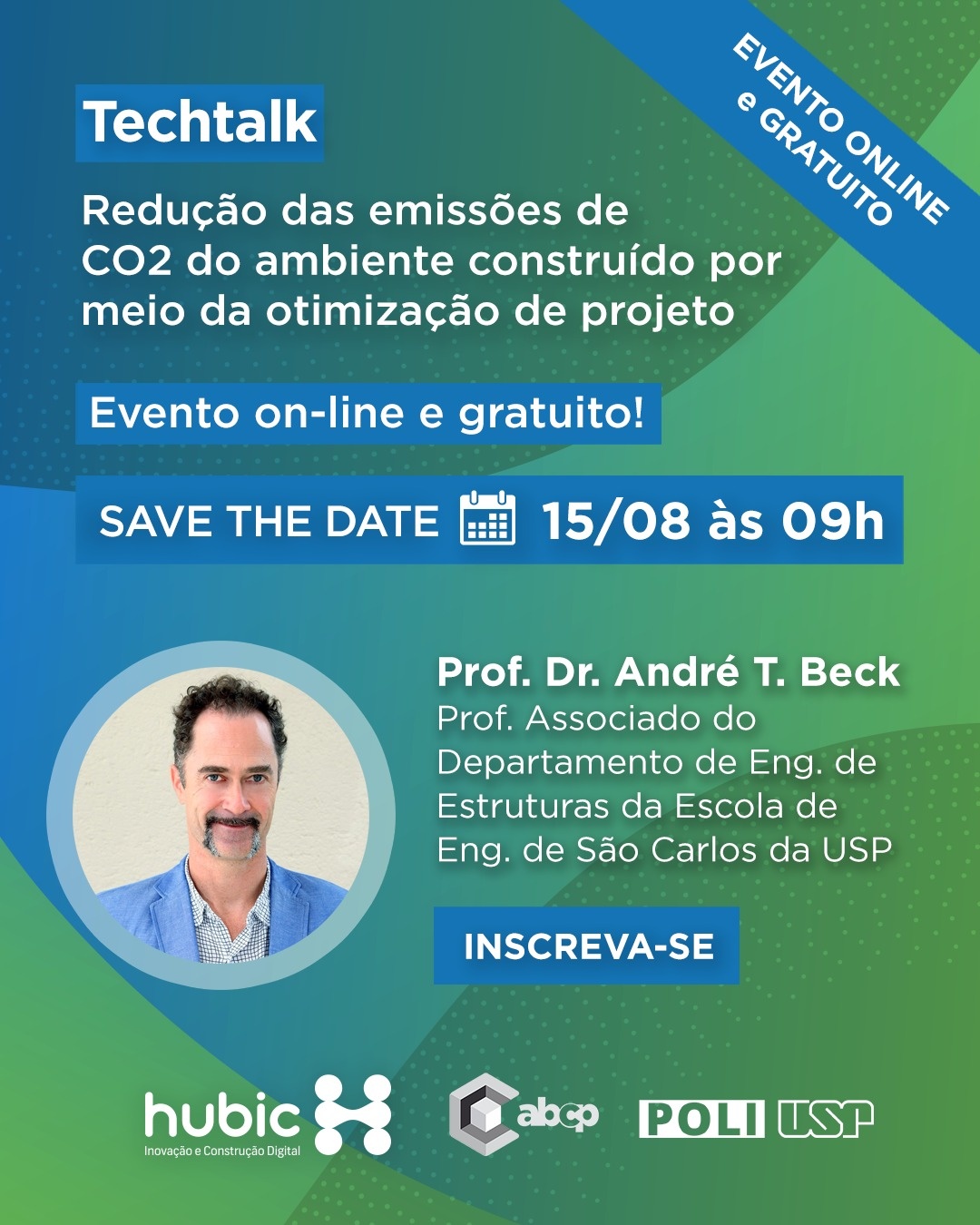 Participe do Techtalk: Redução das emissões de CO2 do ambiente construído por meio da otimização de projeto, ministrado pelo Prof. Dr. André T. Beck, associado do Departamento de Eng. de Estruturas da Escola de Eng. de São Carlos da USP.