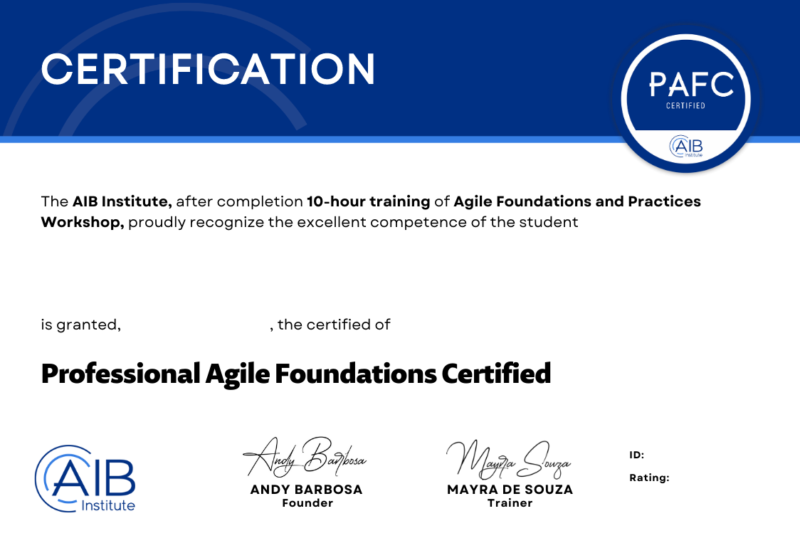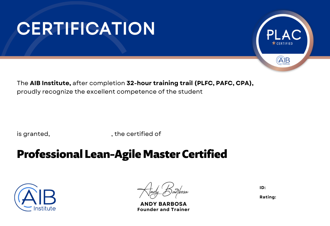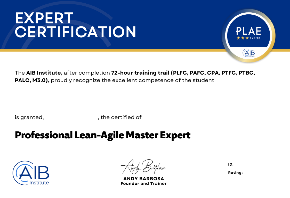 Tanto o certificado do Treinamento Agile Foundations como os das trilhas de aprendizagem PLAC e PLAE são emitidos pelo AIB Institute.