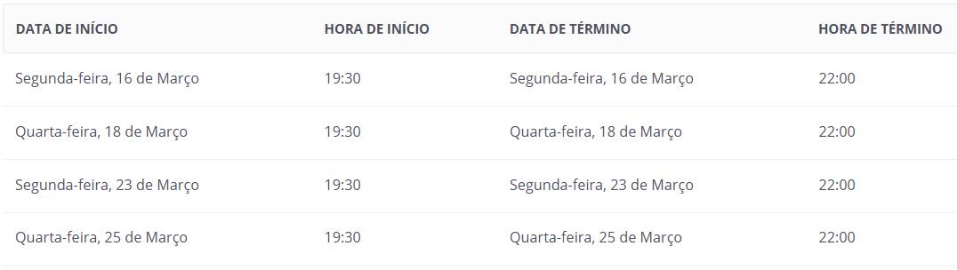 ATENÇÃO: Este Treinamento Online tem duração de 10 (dez) horas, distribuídas em 4 sessões de 2 horas e 30 minutos cada uma, o participante deve estar ciente de que Treinamento Online AO VIVO ocorrerá nas seguintes datas e horários (HORÁRIO DE BRASÍLIA):