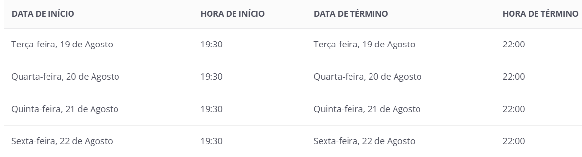 ATENÇÃO: Este Treinamento Online AO VIVO tem duração de 10 horas distribuídas em 4 sessões de 2 horas e 30 minutos. Ao se inscrever o participante declara estar ciente de que Treinamento Online AO VIVO ocorrerá nas seguintes datas e horários (HORÁRIO DE BRASÍLIA):