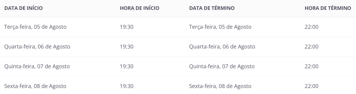 ATENÇÃO: Este Treinamento Online possui carga horária total de 10 (dez) horas, distribuídas em 4 sessões de 2 horas e 30 minutos cada uma. Ao se inscrever o participante declara estar ciente de que Treinamento Online AO VIVO ocorrerá nas seguintes datas e horários (HORÁRIO DE BRASÍLIA):