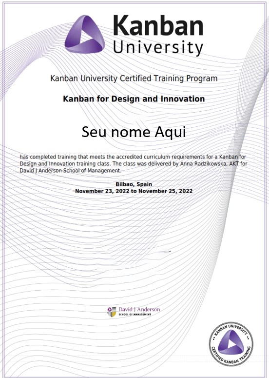 KDI – Kanban for Design and Innovation – emitida pela Kanban University – reconhecida internacionalmente como órgão criador do Método Kanban.