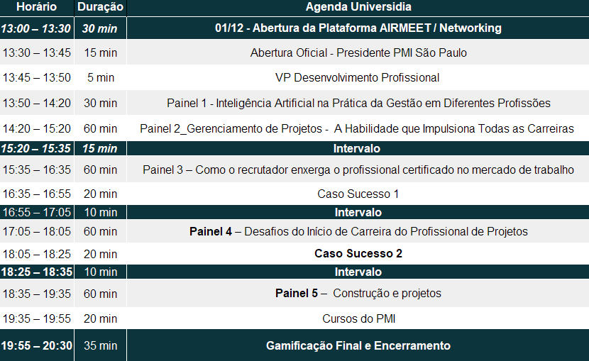 Venha participar do Universidia, um evento imperdível organizado pelo PMI São Paulo! Totalmente online e gratuito, o Universidia é voltado para estudantes e professores que desejam se manter atualizados nas tendências e inovações educacionais.
