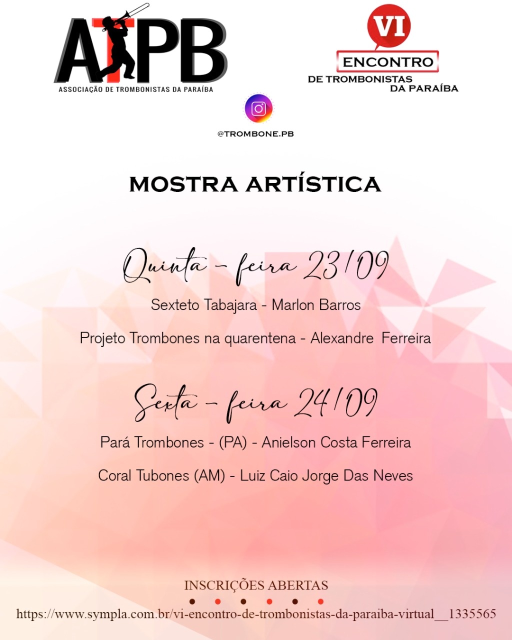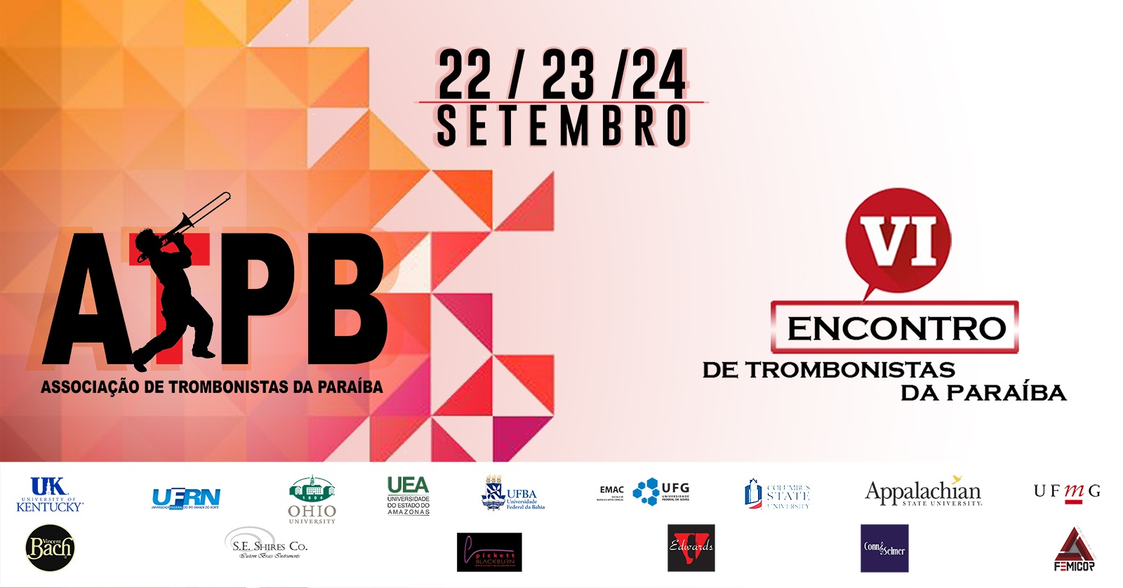 É com grande satisfação que convidamos a todos para participar do VI Encontro de Trombonistas da Paraíba que será realizado nos dias 22, 23 e 24 de setembro de 2021Teremos convidados nacionais e internacionais durante os três dias. De acordo com as orientações de isolamento social devido o COVID-19, todas atividades serão de forma Virtual, através do Zoom.