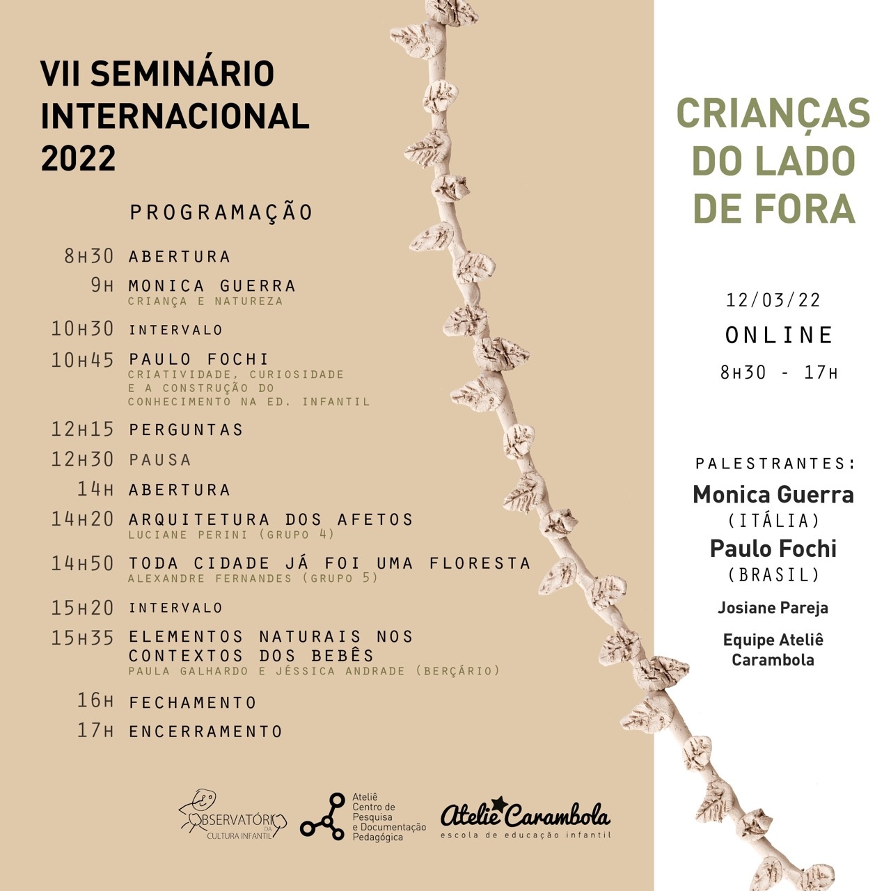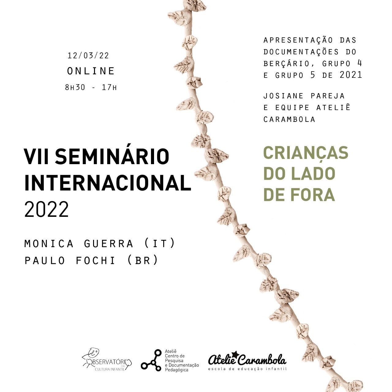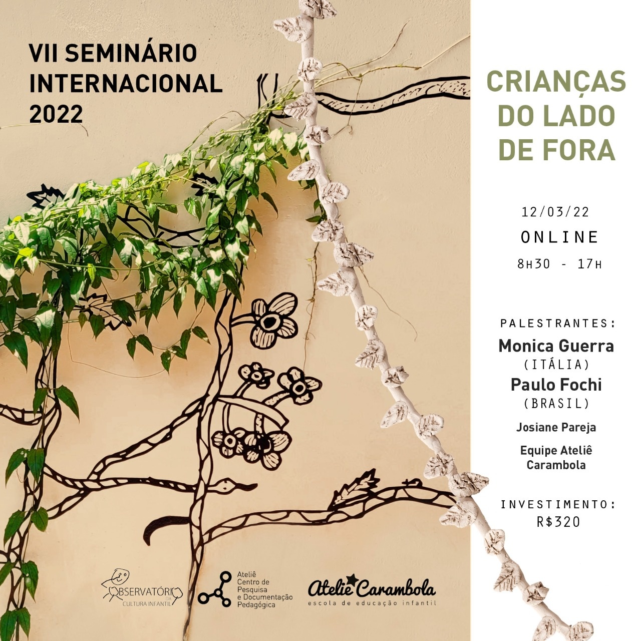 Com muita alegria anunciamos o VII Seminário Internacional, CRIANÇAS DO LADO DE FORA do Ateliê Centro de Pesquisa e Documentação Pedagógica em parceria com a Ateliê Carambola Escola de Educação Infantil e o OBECI - Observatório da Cultura Infantil.