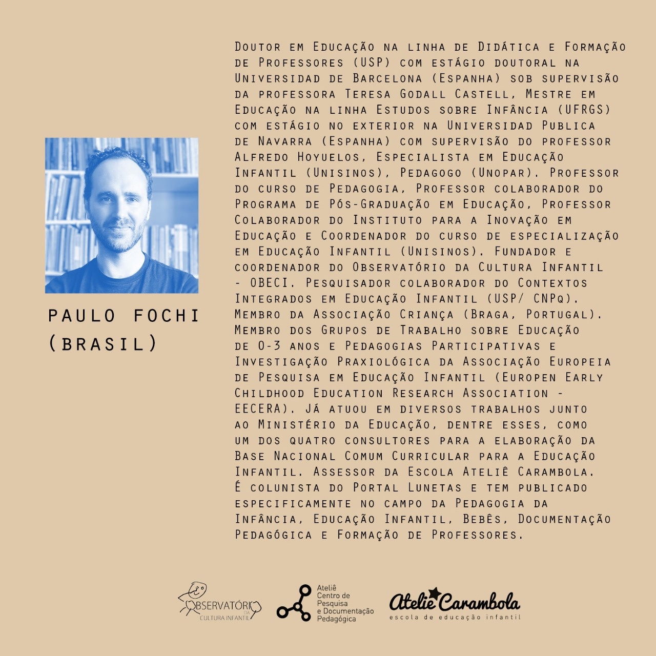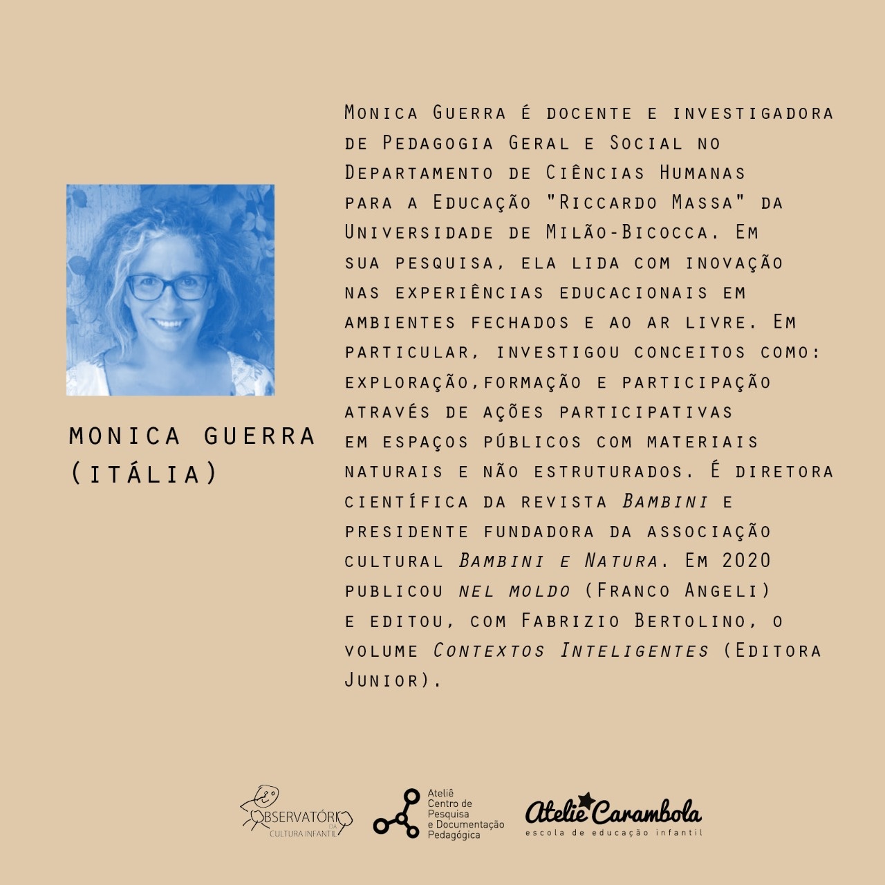 Teremos a presença de MONICA GUERRA, professora e pesquisadora na Universidade de Milano-Bicocca. Monica é diretora científica da revista Bambini e presidente fundadora da associação cultural Bambini e Natura (Itália). Autora de diversos livros e artigos, tem publicado especialmente sobre crianças, natureza e criatividade. PAULO FOCHI, é professor e pesquisador da Universidade do Vale do Rio dos Sinos, fundador do OBECI. Doutor em Educação (FE-USP), Mestre em Educação (UFRGS), tem publicado especialmente no campo da documentação pedagógica, formação de professores e prática pedagógica na Educação Infantil.