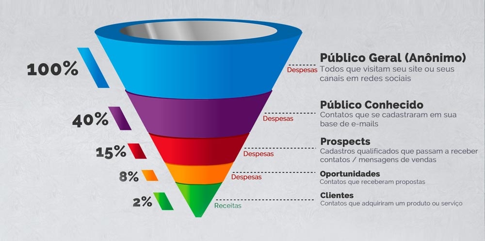 Abaixo uma imagem que demonstra a formação de um Funil de Vendas e as etapas que discutiremos nesse Webinar.