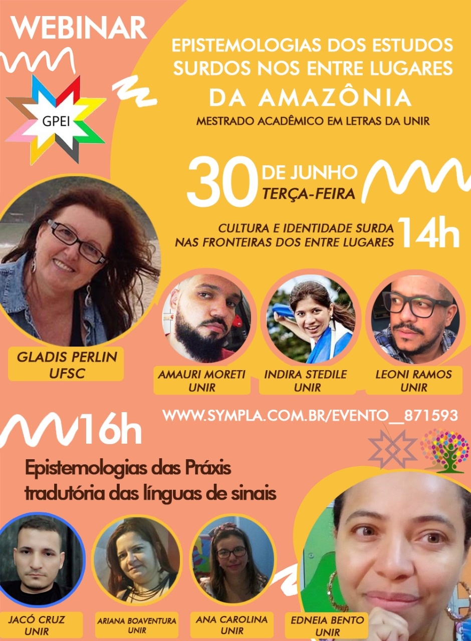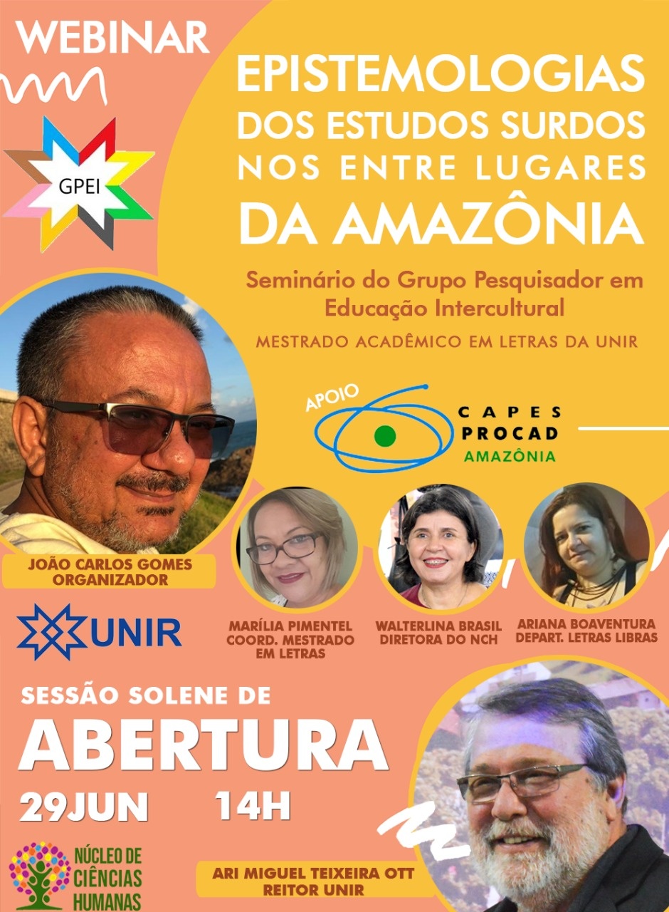 EPISTEMOLOGIAS DOS ESTUDOS SURDOS NOS ENTRE LUGARES DA AMAZÔNIA.  É um seminário do Grupo Pesquisador em Educação Intercultural (GPEI), vinculado ao Mestrado Acadêmico em Letras (ML), Departamento de Libras (DLIBRAS), Núcleo de Ciências Humanas (NCH),Universidade Federal de Rondônia (UNIR), com apoio do Procad-Amazônia, para realização de diálogos interdisciplinares voltados para as línguas de sinais  e relações interculturais da educação de surdos nos entre lugares da Amazônia.