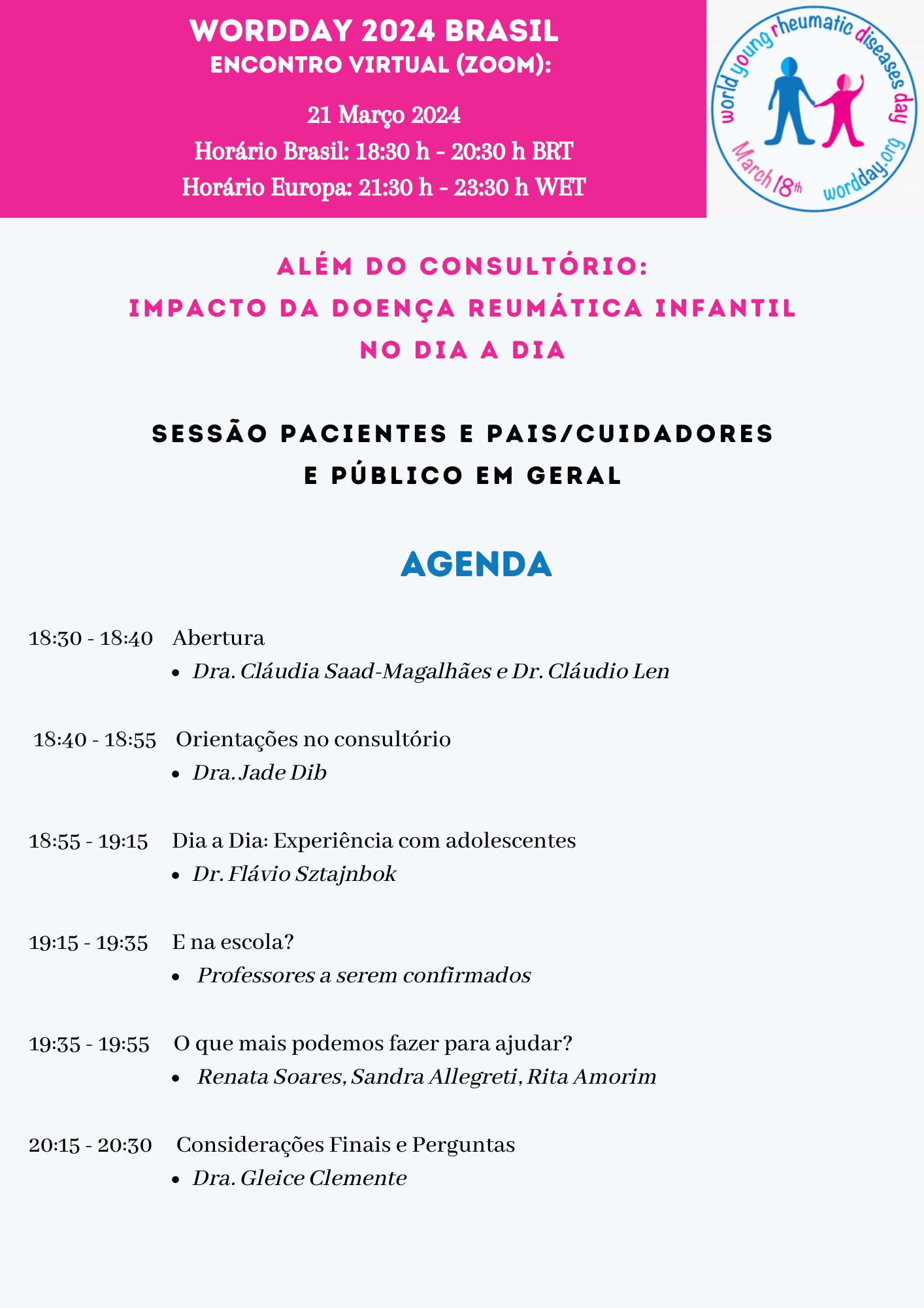Essa sessão é voltada para pacientes, pais e cuidadores, mas profissionais de saúde também podem se registrar. Vamos conversar em torno de 2 horas, e estarao presentes reumato pediatras, pacientes, psicólogos, fisioterapeutas, entre outros. Dê uma olhada na agenda abaixo.