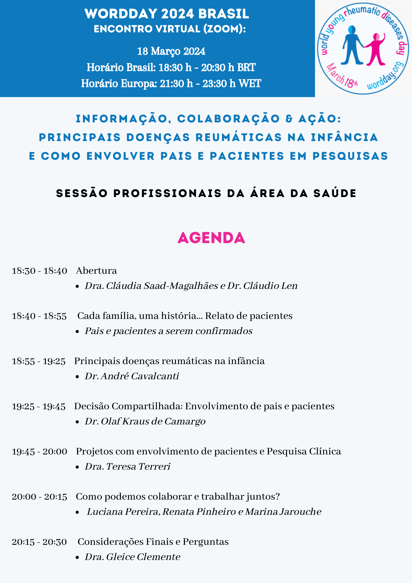 Essa sessão é voltada para profissionais da área da saúde. Alguns pacientes farão um breve relato da sua jornada e vamos conversar em torno de 2 horas. Estarão presentes reumato pediatras, psicólogos, fisoterapeutas, entre outros. Confira a agenda abaixo.