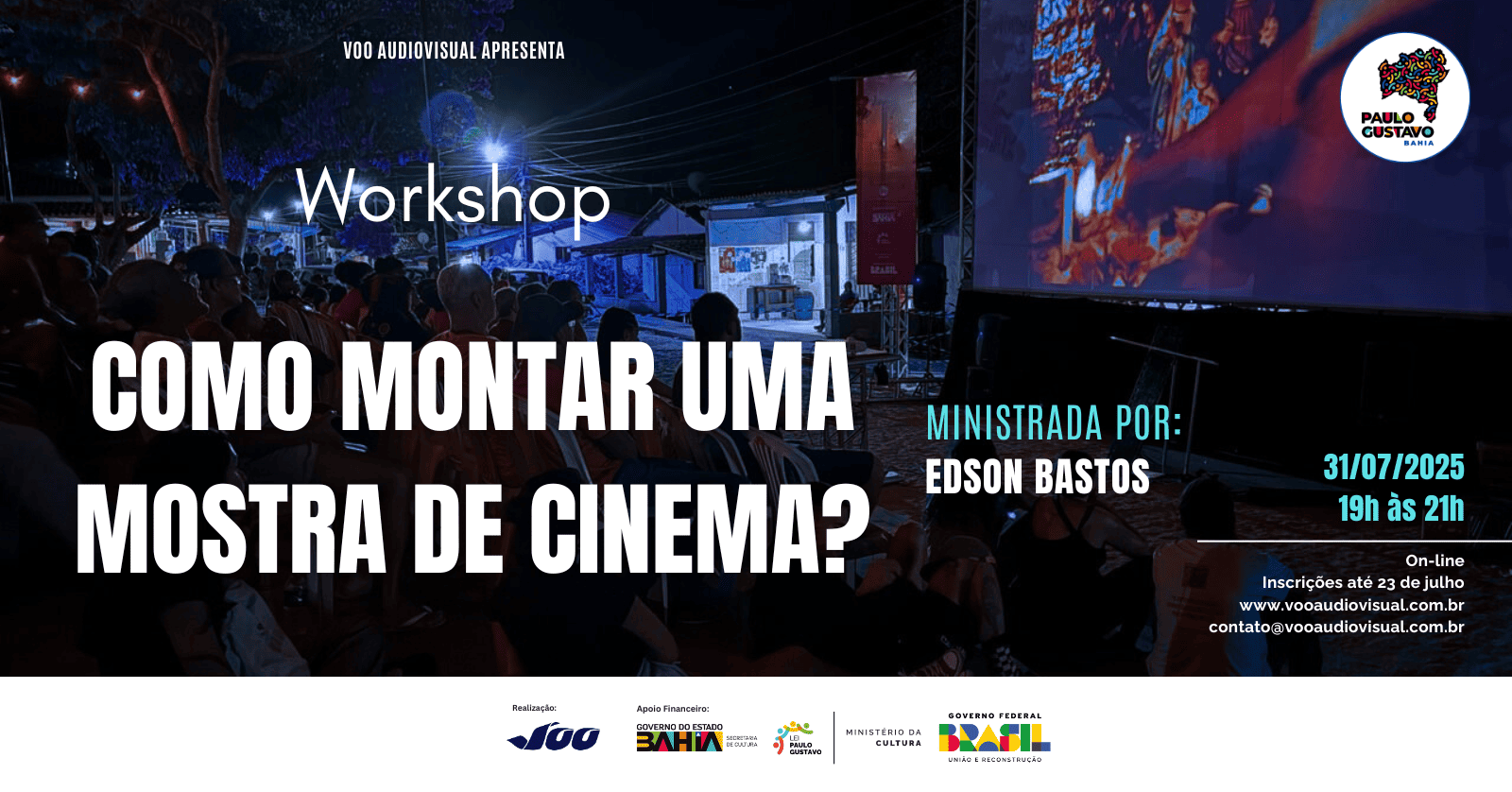 O Workshop “Como Montar uma Mostra de Cinema” é uma contrapartida do projeto “4º Circuito Cine Éden, produzido pela Voo Audiovisual e contemplado nos Editais da Lei Paulo Gustavo Bahia e tem apoio financeiro do Governo do Estado da Bahia por meio da Secretaria de Cultura via Lei Paulo Gustavo, direcionada pelo Ministério da Cultura, Governo Federal. Paulo Gustavo Bahia (LPGBA) foi criada para a efetivação das ações emergenciais de apoio ao setor cultural, visando cumprir a Lei Complementar n° 195, de 08 de julho de 2022.
