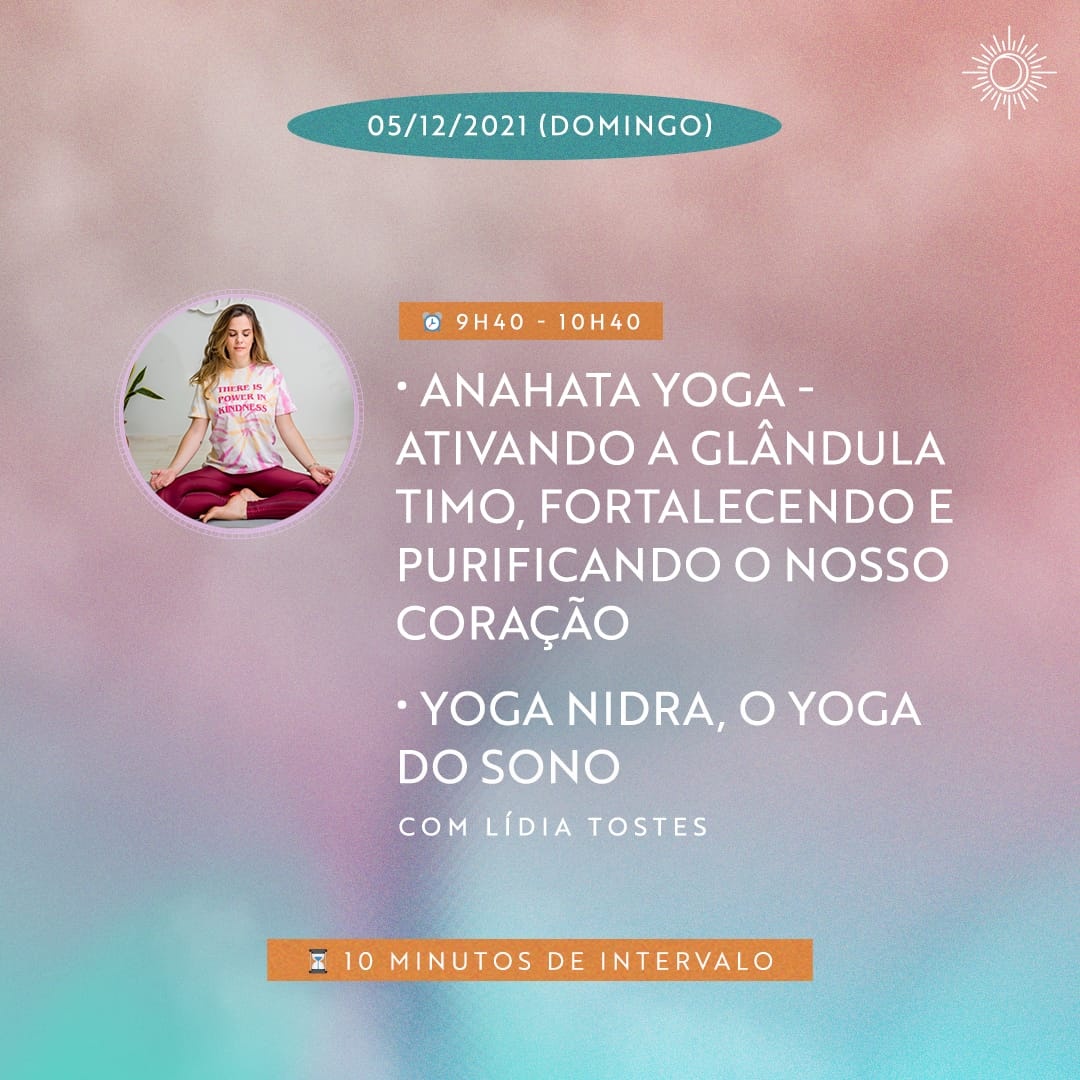 Com direito a tudo o que contempla uma boa prática de Yoga: asanas (posturas e movimentos corporais), soltura das articulações, pranayamas (técnicas de respiração), relaxamento e meditação, que visam o despertar do corpo, da mente e do coração. Com objetivo de conexão e equilíbrio físico, energético e espiritual, para melhorar a percepção da vida, sobre nós mesmos e sobre o mundo.