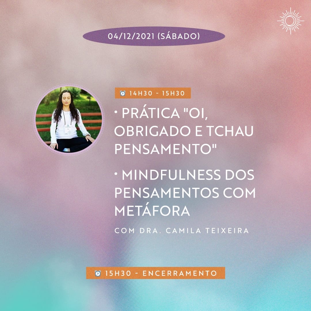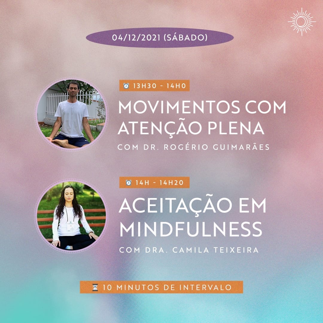 Mindfulness envolve direcionar a nossa atenção às sensações corporais, aos pensamentos, sentimentos e emoções que surgem no momento presente, a fim de aumentar a consciência sobre nós mesmos. A atenção plena é uma prática integrativa corpo-mente-coração, que promove uma mudança na maneira como nos relacionamos com as nossas próprias experiências, sejam elas consideradas como "boas" ou "ruins". Durante o nosso Workshop vocês serão convidados a conhecer diversas práticas meditativas baseadas em Mindfulness, como: escaneamento corporal, respiração consciente, pensamentos com metáfora, monitoramento aberto, compaixão, autocompaixão e movimentos corporais com atenção plena.