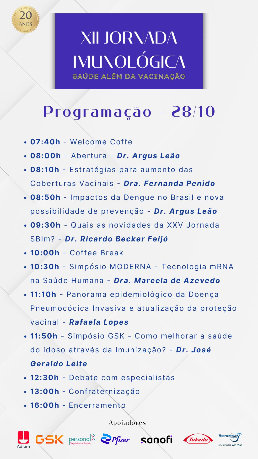 Em comemoração aos 20 anos da Imunológica, convidamos você para a 12ª Jornada Imunológica - Saúde além da Vacinação. Um evento que irá abordar os avanços e descobertas recentes na área da Imunização, trazendo informações relevantes sobre outros aspectos em relação a prevenção e promoção da saúde.