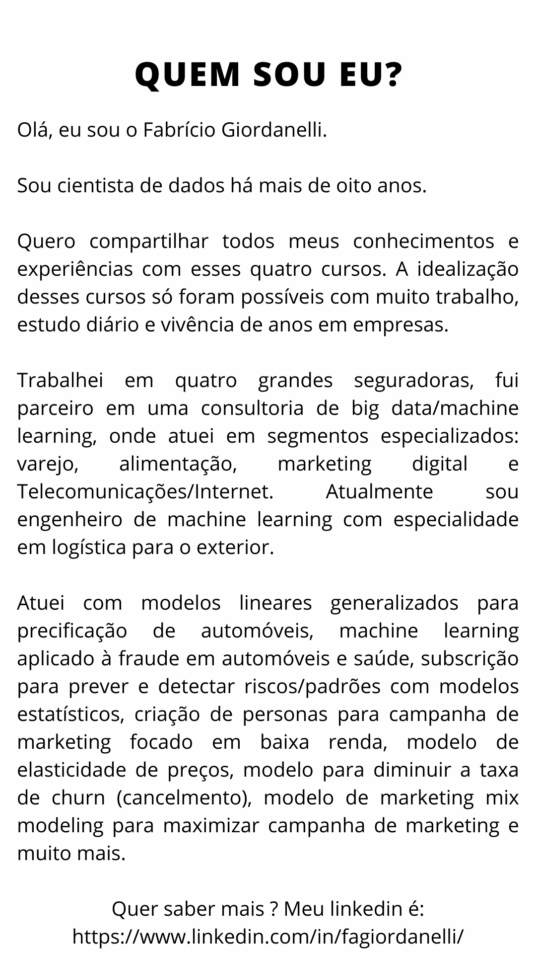 Olá, eu sou o Fabrício Giordanelli. Utilizo há mais de sete anos no dia a dia das empresas as linguagens R, Python, SAS e SQL. Resolvi disponibilizar todos meus conhecimentos e toda a minha experiência com essas aulas on-line. Fui aprovado no concurso do IBGE para o cargo de estatístico ainda cursando a faculdade. Trabalhei em quatro grandes seguradoras e atualmente trabalho em uma consultoria de big data.