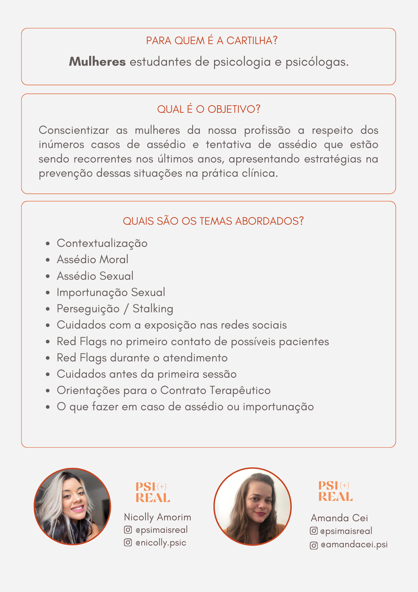 Somos Amanda Cei Santos Pirola (CRP 16/3526) e Nicolly Emanuelle Amorim dos Santos (CRP 15/6193), duas psicólogas que já passaram pelos desafios de começar na clínica e sabem como pode ser difícil encontrar um caminho seguro e autêntico nessa jornada. Foi pensando nisso que criamos a PSI (+) REAL, através da qual produzimos conteúdos, infoprodutos e eventos para apoiar psis nos bastidores da clínica.