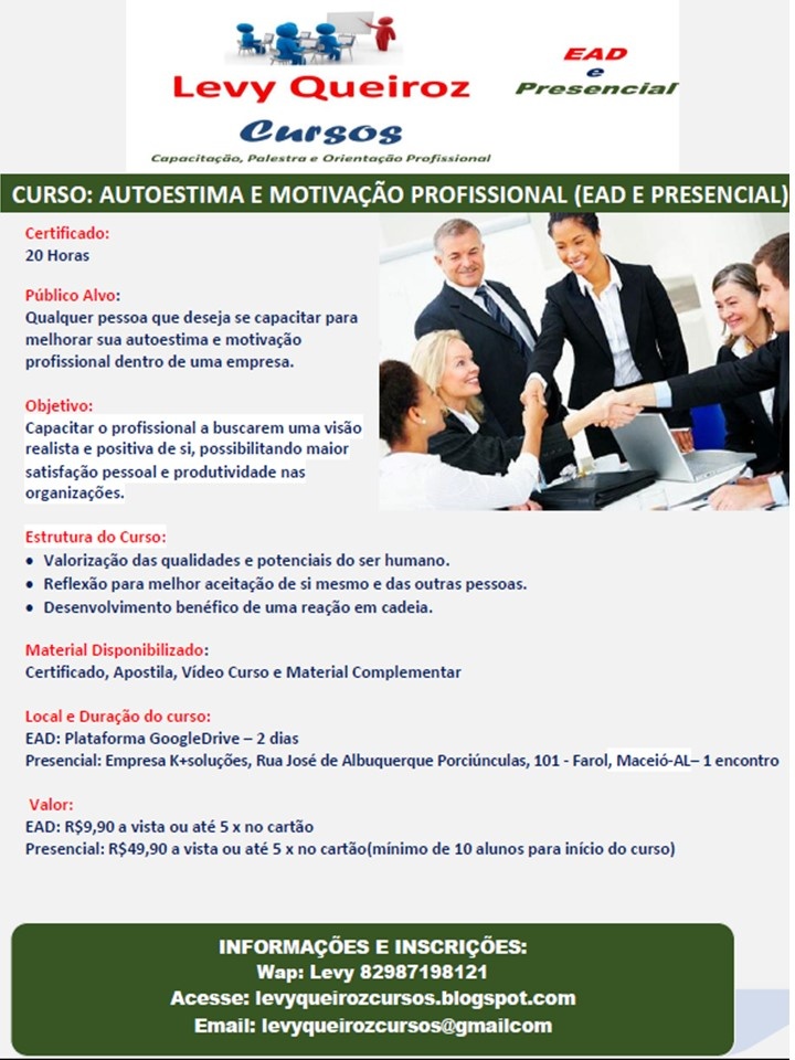 Os cursos da empresa Levy Queiroz Cursos, são ministrados pelo Profª Levy de Queiroz Carmo, que tem a formação em Estudos Avançados no Programa de Doutoramento em Educação, Mestrado em Recursos Humanos e Gestão do Conhecimento, Especialização em Administração Hospitalar e Graduação em Administração de Empresas. Atuou como Coordenador Administrativo e em diversas atividades administrativa por mais de 20 anos. Atualmente é Professor Universitário, Instrutor de Cursos, Palestrante e Consultor.