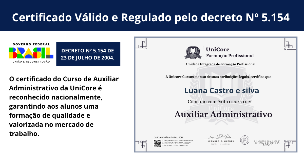 O Curso de Auxiliar Administrativo da UniCore é a oportunidade ideal para quem deseja ingressar no mercado de trabalho com conhecimento e confiança. 100% on-line e no seu ritmo, com 40 horas de conteúdo prático, você aprenderá desde os fundamentos da administração até as rotinas essenciais para atuar em qualquer empresa.